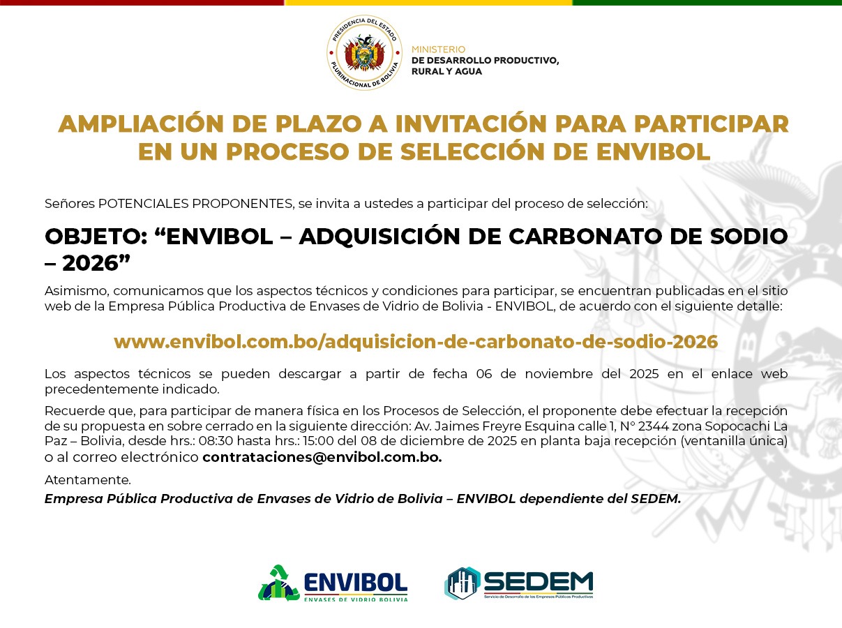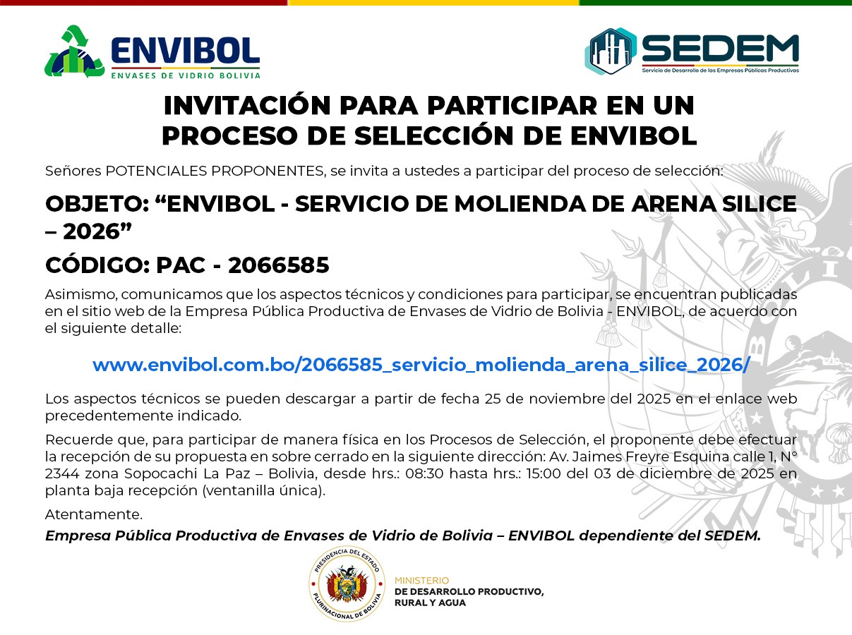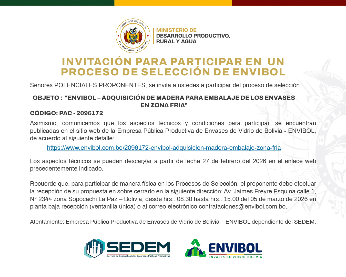Somos la Empresa de Envases de Vidrio de Bolivia – ENVIBOL, parte del Servicio de Desarrollo de las Empresas Productivas – SEDEM.