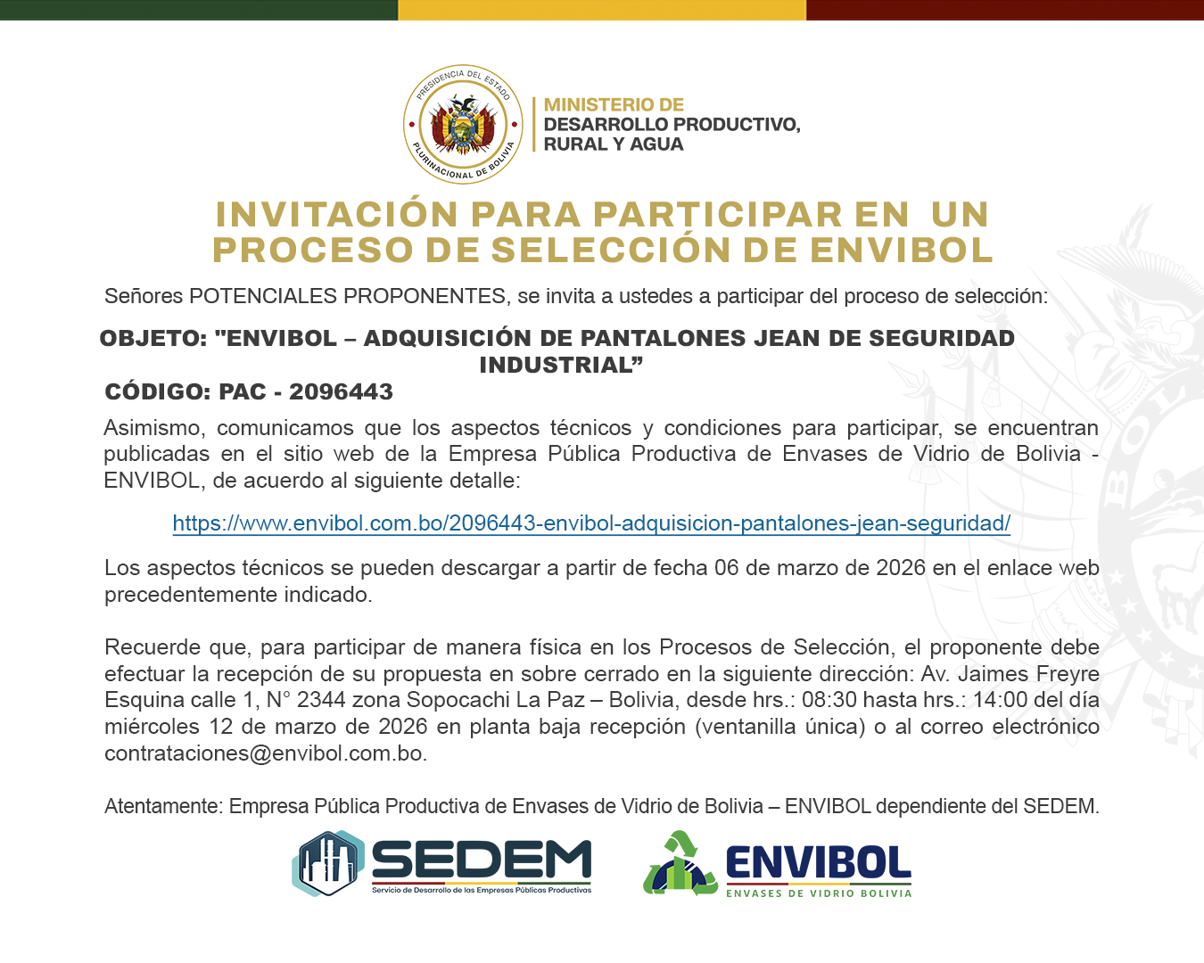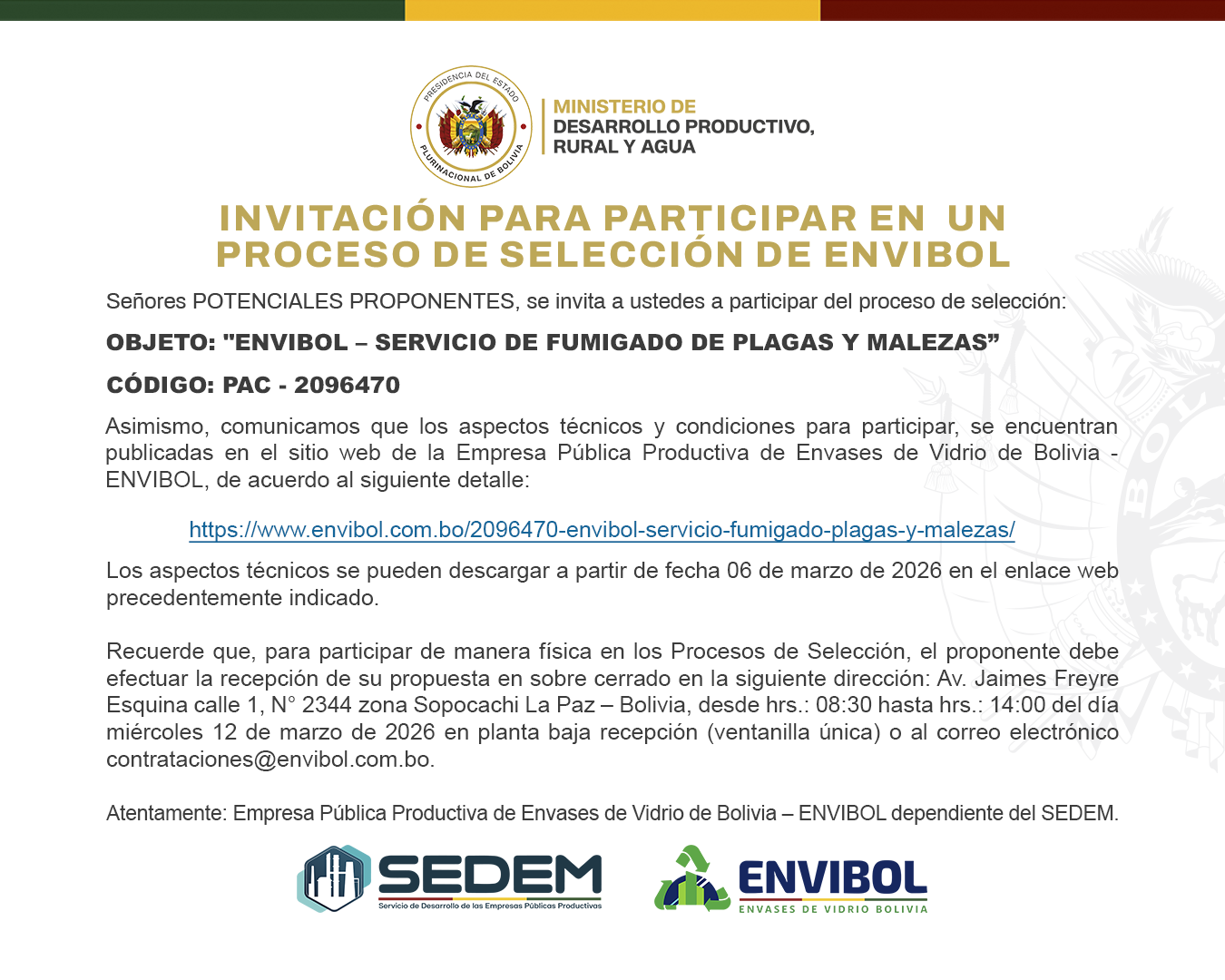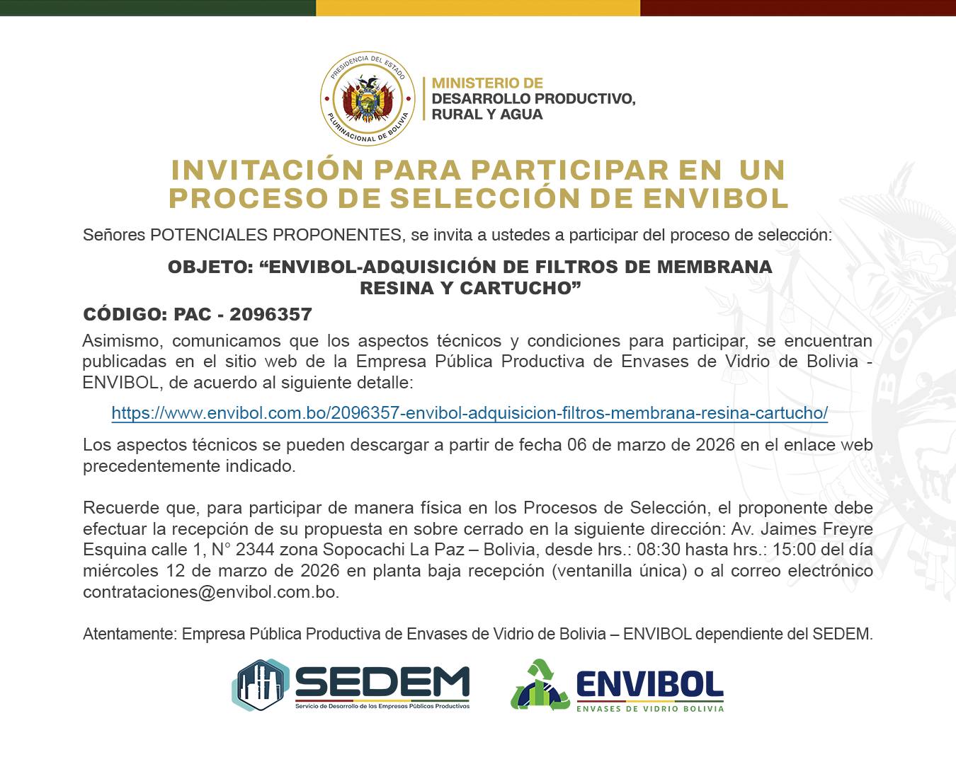 Somos la Empresa de Envases de Vidrio de Bolivia – ENVIBOL, parte del Servicio de Desarrollo de las Empresas Productivas – SEDEM.