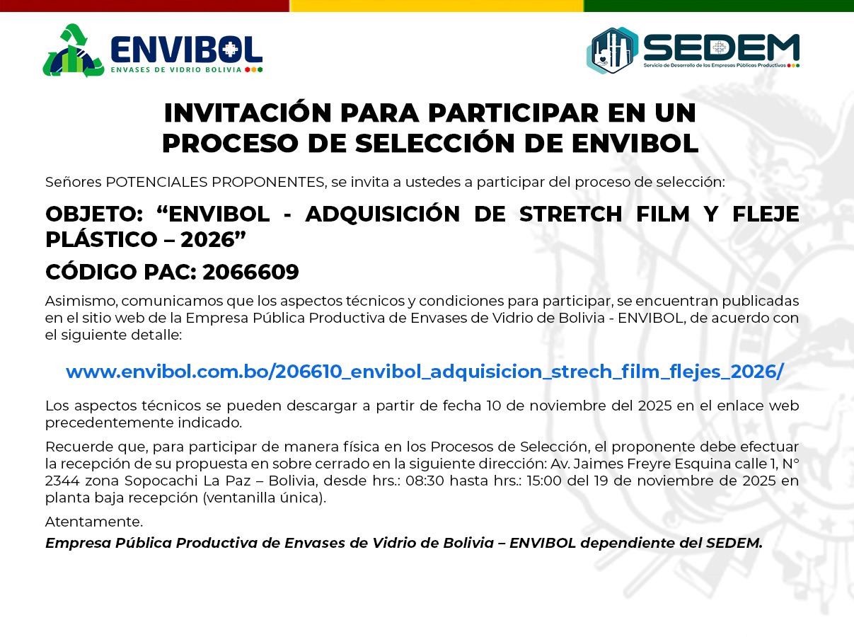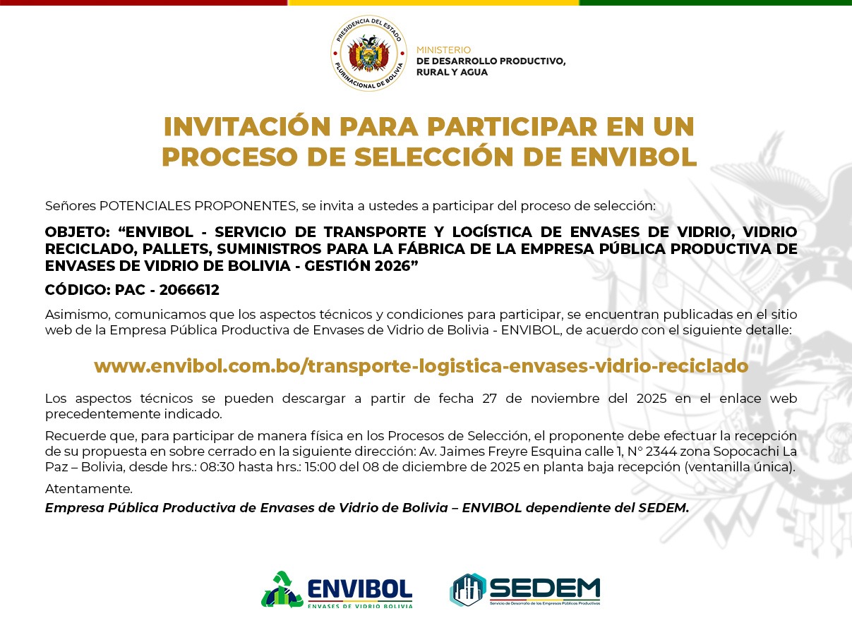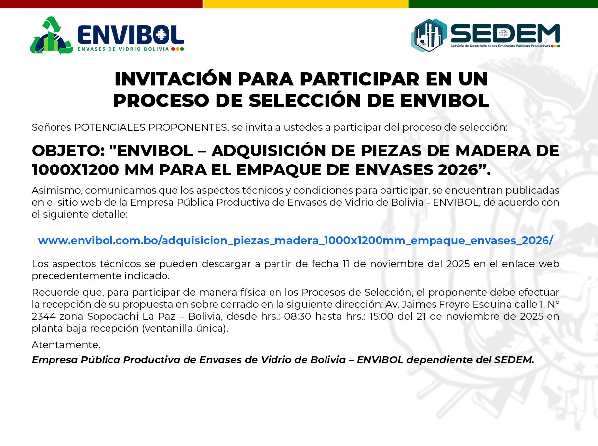 ENVIBOL – ADQUISICIÓN DE PIEZAS DE MADERA DE 1000X1200 MM PARA EL EMPAQUE DE ENVASES 2026