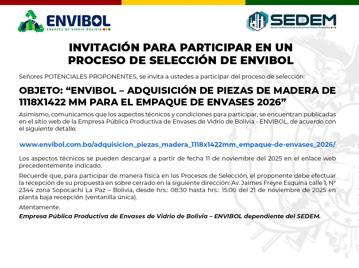 ENVIBOL – ADQUISICIÓN DE PIEZAS DE MADERA DE 1118X1422 MM PARA EL EMPAQUE DE ENVASES 2026