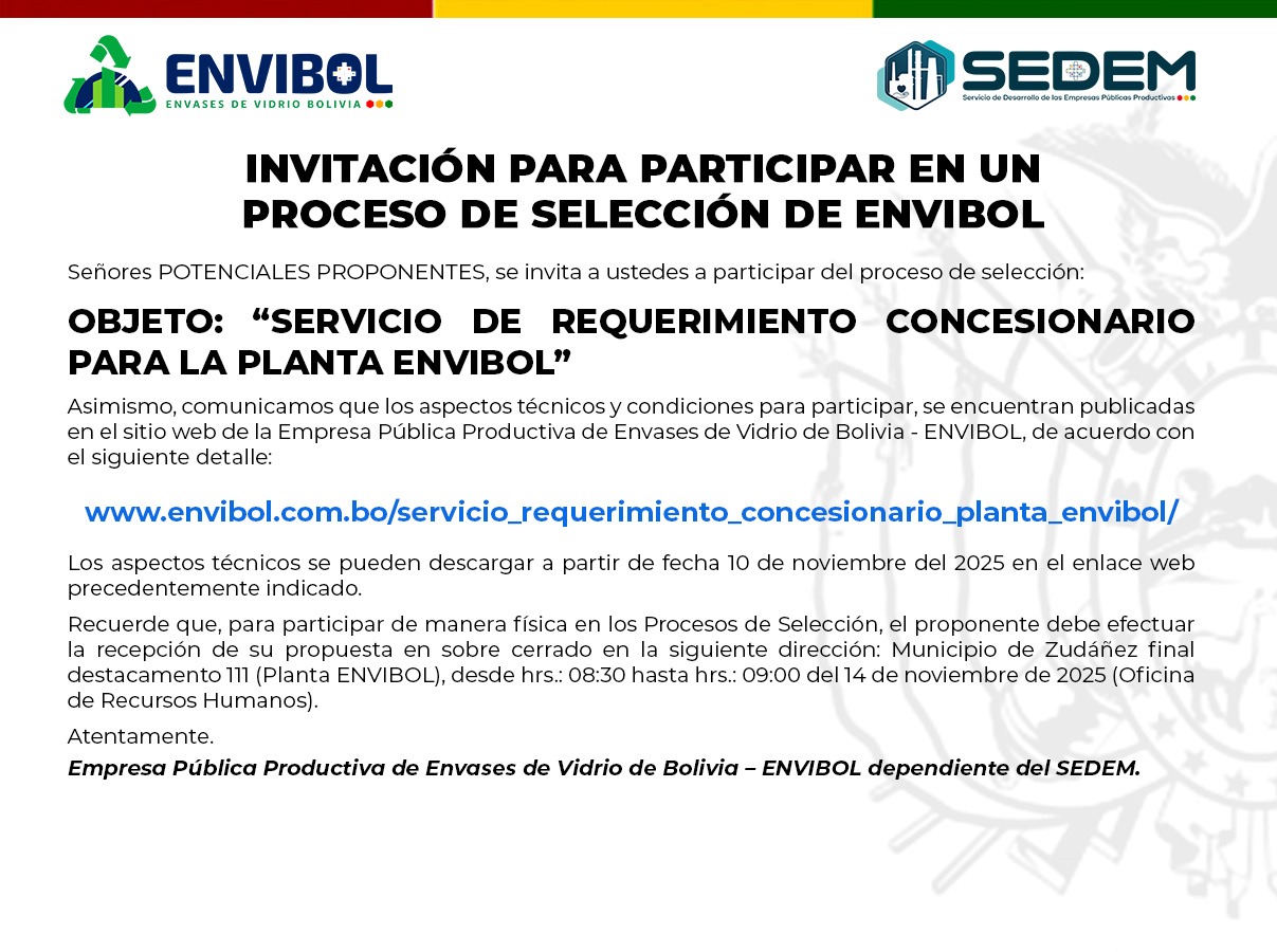 ENVIBOL – SERVICIO DE REQUERIMIENTO CONSESIONARIO PARA LA PLANTA ENVIBOL