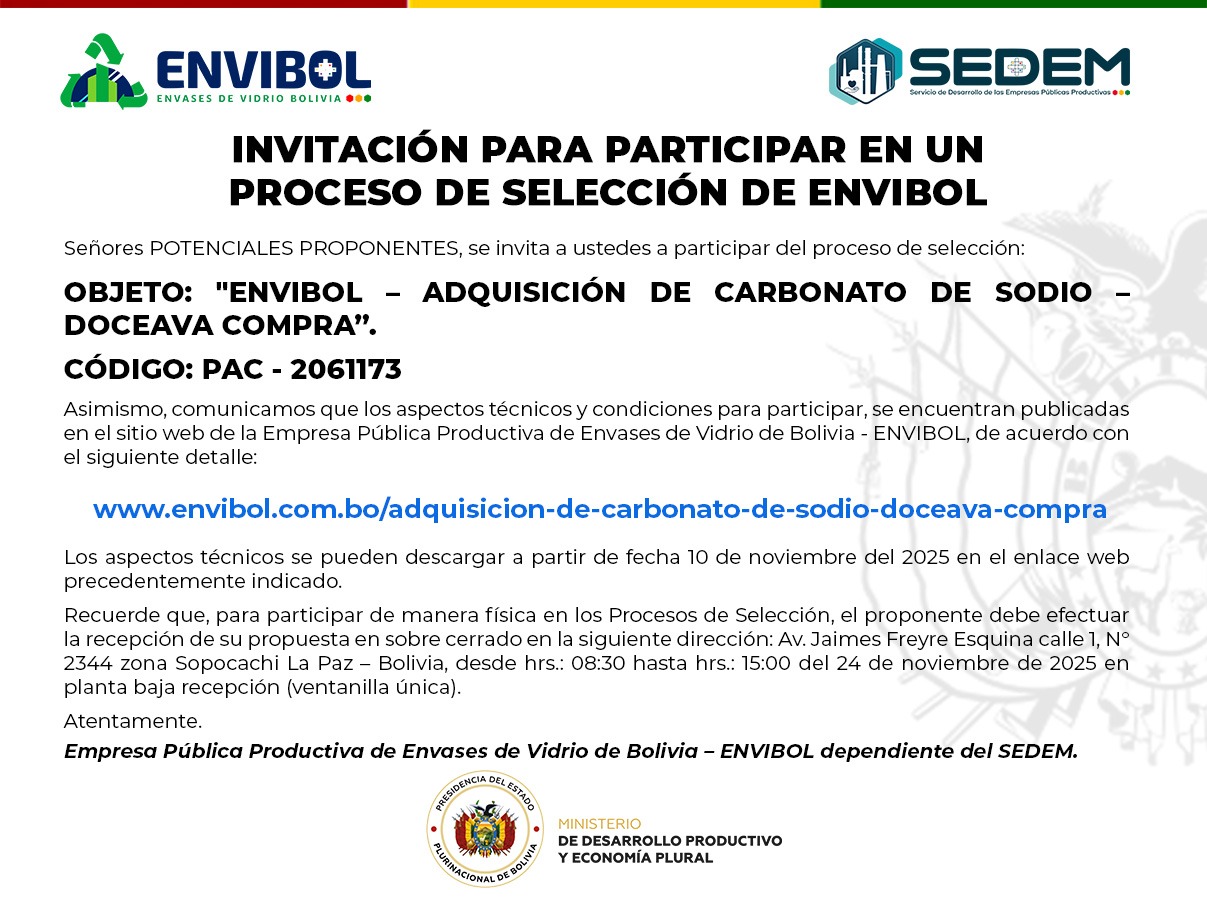 ENVIBOL – ADQUISICIÓN DE CARBONATO DE SODIO – DOCEAVA COMPRA