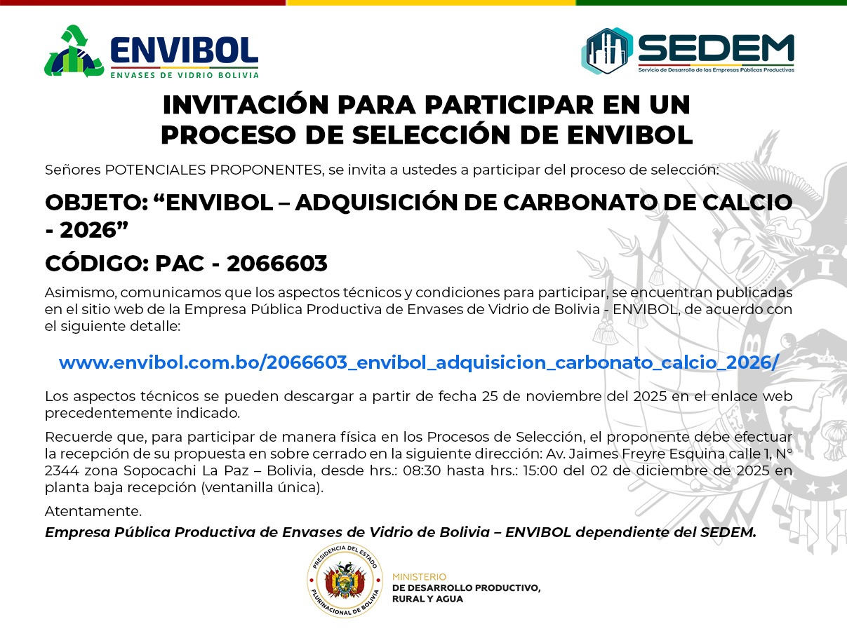 "ENVIBOL - ADQUISICIÓN DE CARBONATO DE SODIO LOTE 2"